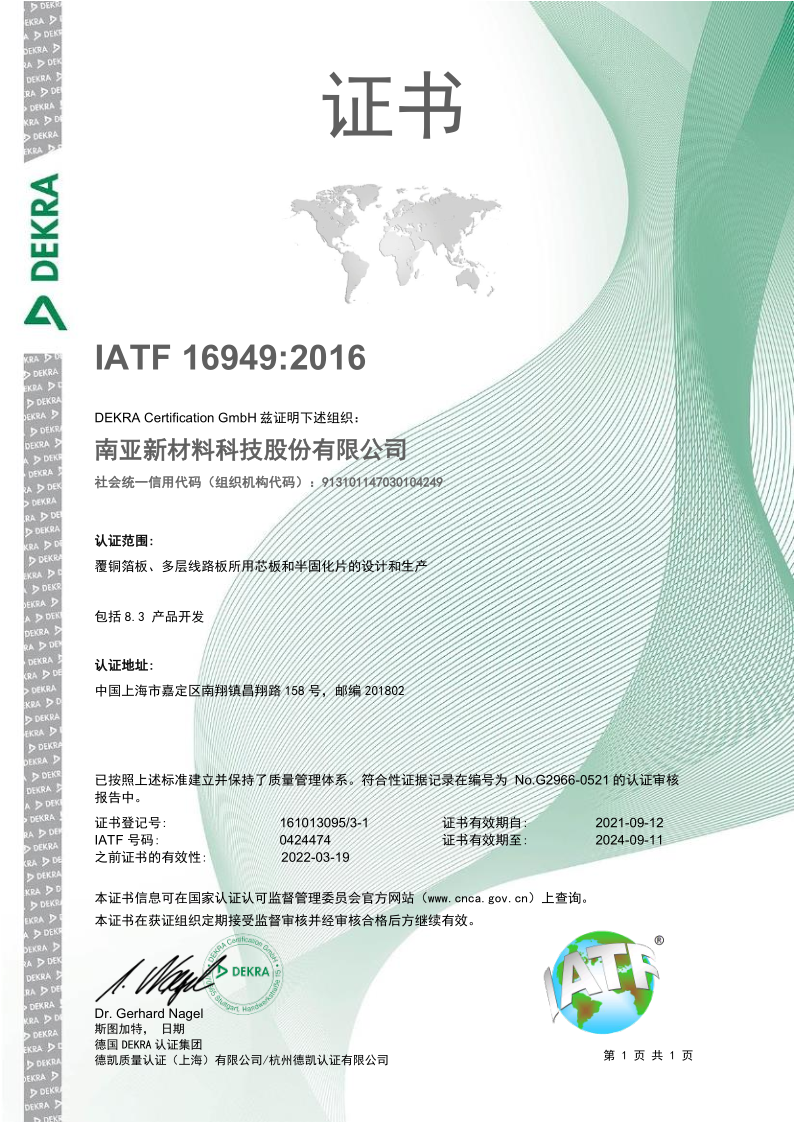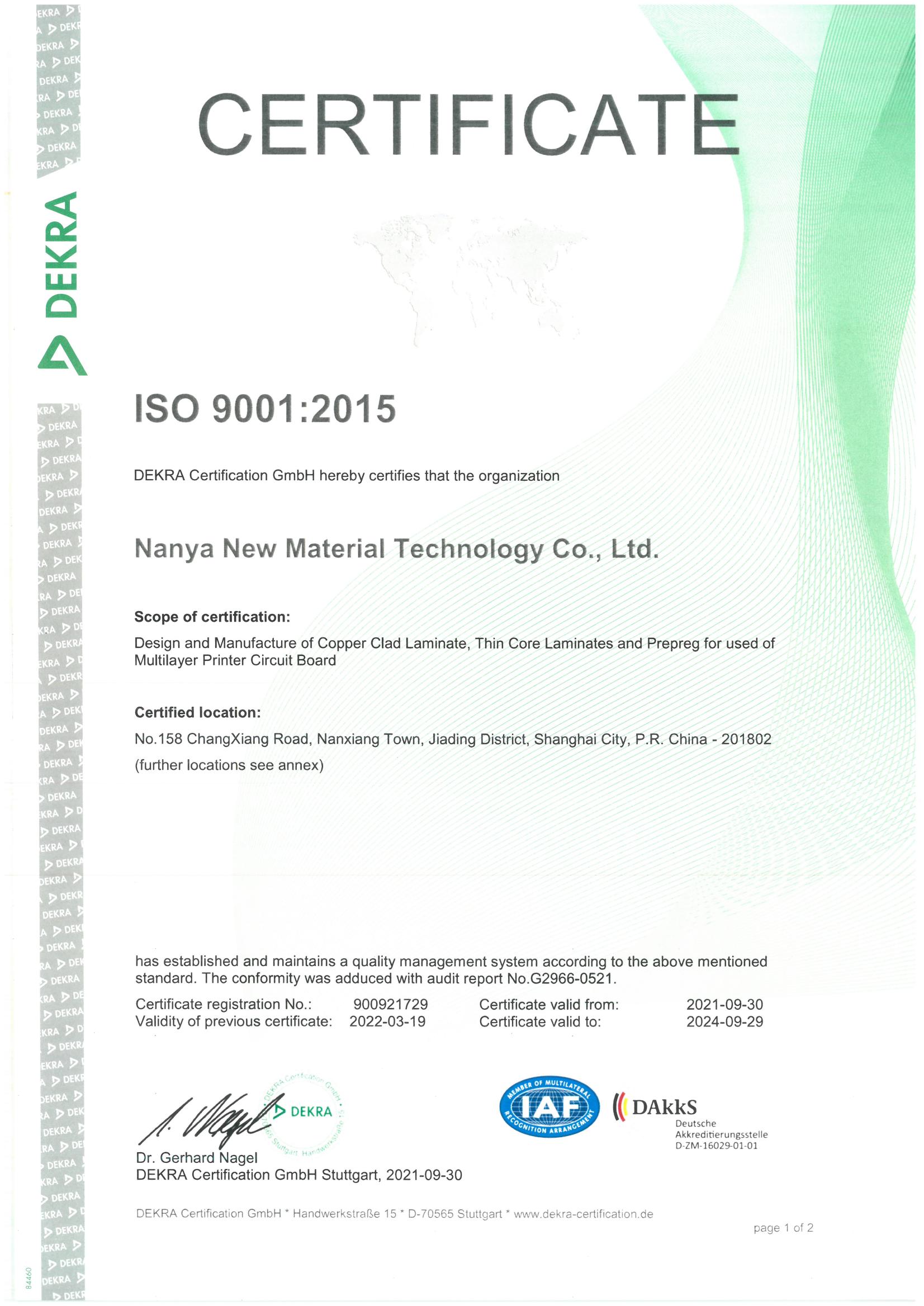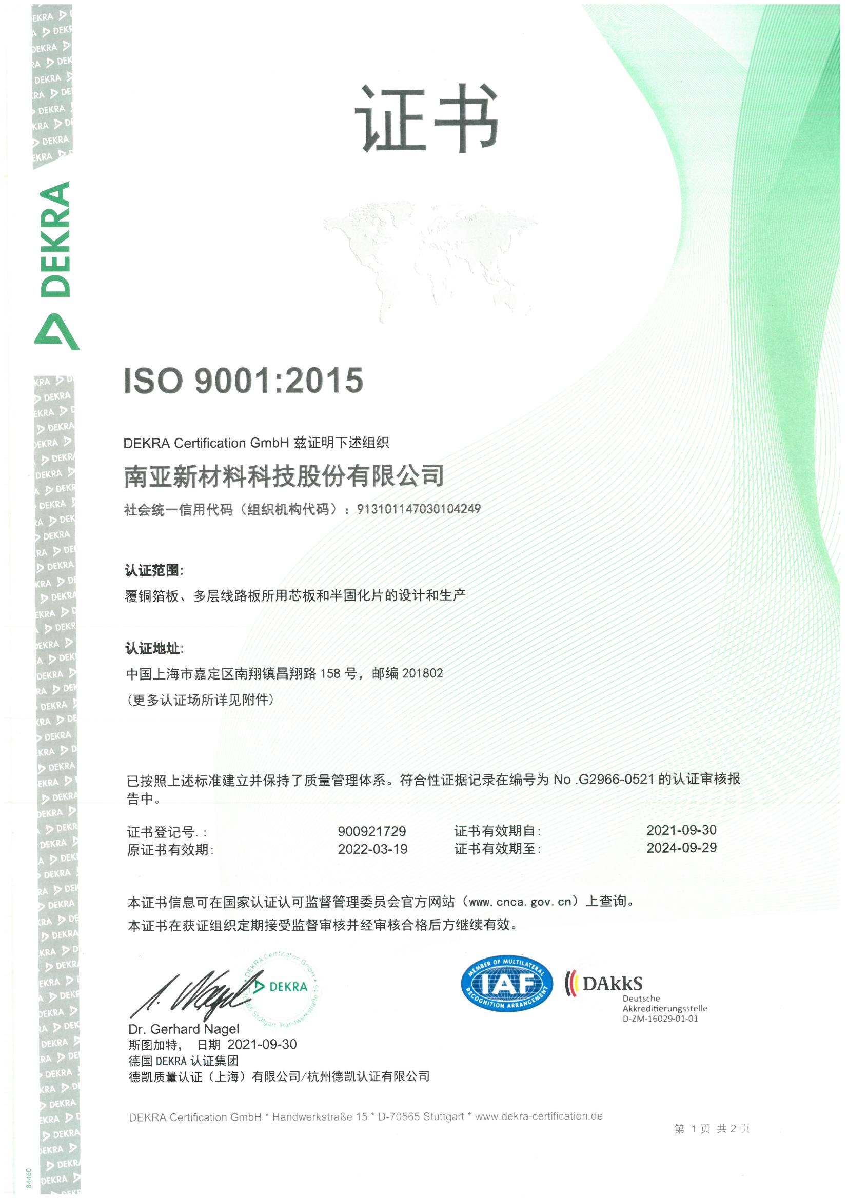 南亞新材始終堅持質量就是生命,持續不斷的改進生產技術和服務水平,不斷完善質量管理體系,務求滿足并超越不同客戶的要求和期望;經過不懈的努力,公司先后通過了ISO9001質量管理體系、 ISO14001環境管理體系和ISO45001職業健康安全管理體系的認證及改版升級。